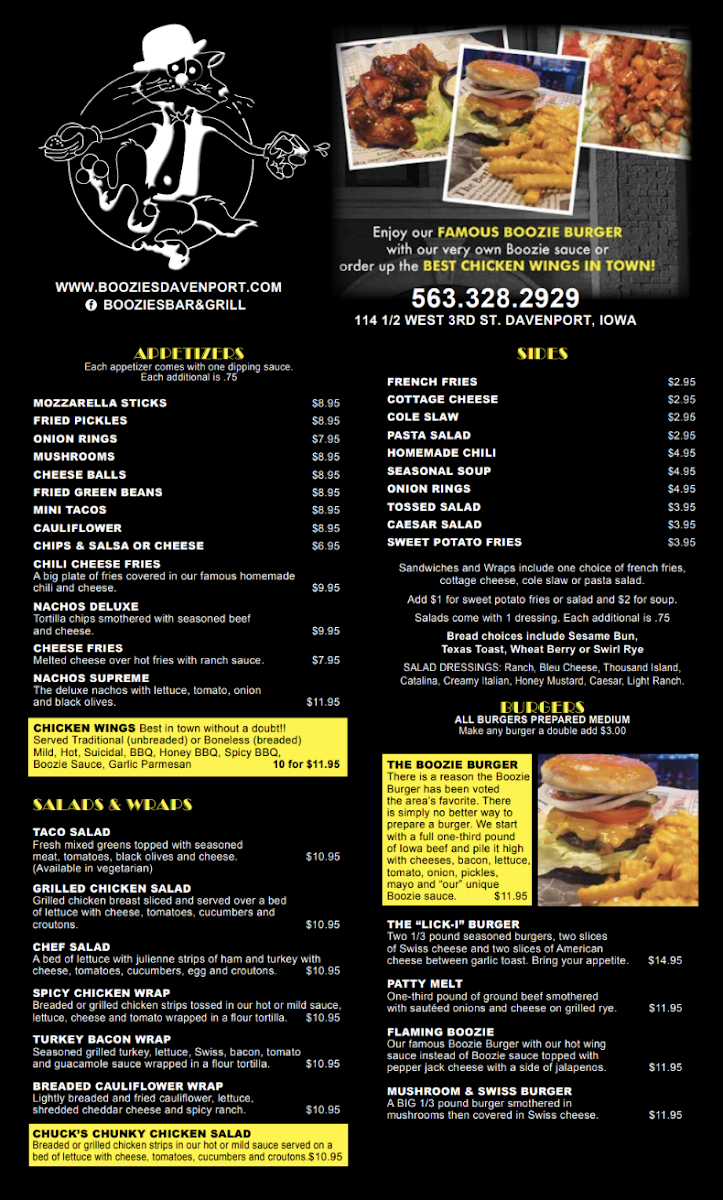 Welcome to Boozie's Bar & Grill, a thriving gem located at 114 W 3rd St, Davenport, IA. This neighborhood hotspot serves up an incredible menu that highlights classic bar fare with a twist. From the mouth-watering Boozie Burger, praised by patrons like Elizabeth Truxell for its unbeatable flavor, to enormous platters of wings that leave guests craving more, every dish tells a story of culinary passion.